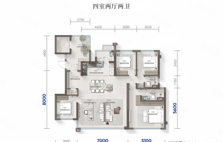 1、采用2梯2户纯板式设计,129-199㎡全系四房户型,满足不同家庭阶段的居住需求