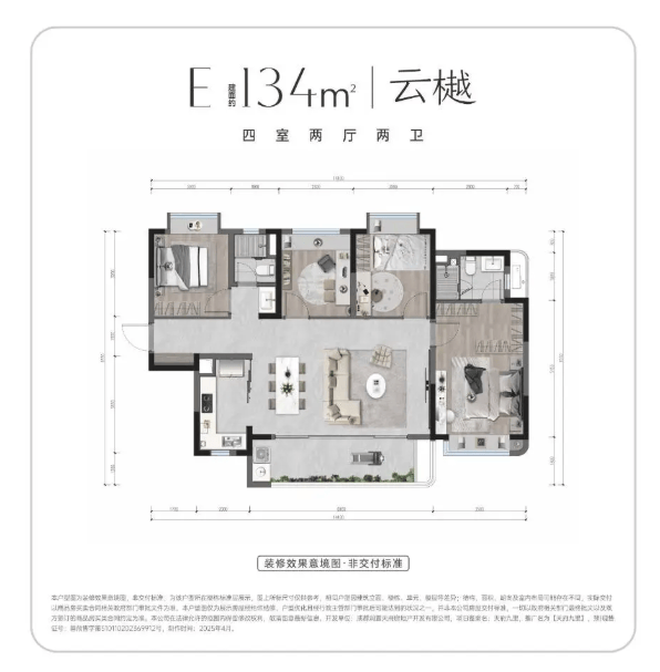 此户型为项目的升级改善之选,在134-140㎡的尺度内,四房两厅的格局更为宽松从容。横厅的面宽进一步扩大,家庭公共活动区域更加气派。主卧多设计为套房,并留有更多的空间用于打造书房、多功能室或更宽敞的儿童房,充分满足二孩家庭或对生活品质有更高要求的改善客群。