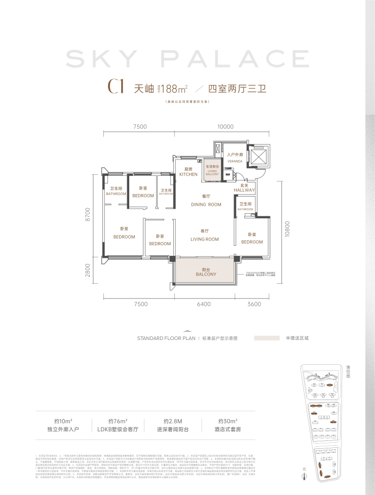 10㎡独立入户玄关,营造归家仪式感;76㎡阔绰双厅,演绎大宅生活美学;双套房设计,构建三代同堂和谐空间;2.8米景观阳台,打造家庭休闲主场