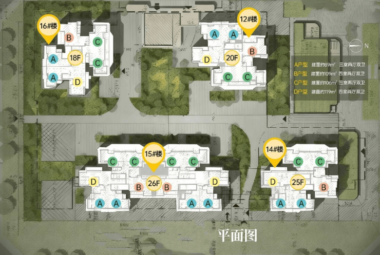 楼栋分布:12#(20层)、14#(25层)、15#(26层)、16#(18层)