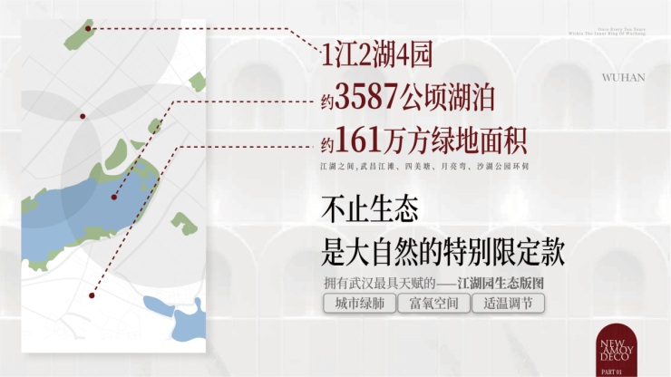 1江(长江)、2湖(东湖/沙湖)、4园(江滩公园、四美塘公园、月亮湾、沙湖公园),约3587公顷湖泊,约161万平方米绿地面积