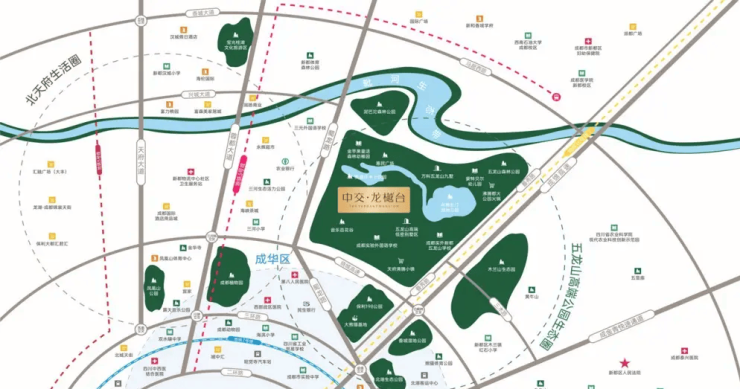 交通网络:地铁3号线/23号线(规划)、双高速(绕城/成绵)、三主干道(蜀龙/蓉都/天府大道北延线)