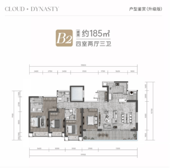 此面积段户型是项目的主力产品,定位为高端家庭的品质改善之选。户型设计强调功能性与舒适度的平衡,通常拥有开阔的横厅或巨幕景观阳台,主卧套房配置彰显尊崇。约169㎡的户型可实现舒适的四房功能,满足多代同堂的基本需求;而约200㎡的户型则能提供更奢阔的公共活动空间与房间尺度。