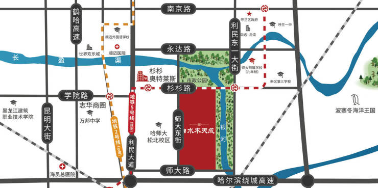 水木天成位于哈尔滨松北区杉杉路与师大东街交汇处,隶属哈尔滨自贸新区,总建筑面积约76万平方米,产品包括舒景小高层,瞰景高层和奢景洋房,可满足各种置业需求;项目周边路网完善,交通便捷,15分钟即可到达地铁2号线学院路站,同时规划5号线也邻近本项目,周边商业配套更加齐全,步行即可到达杉杉奥特莱斯商圈,邻近大学城文脉商圈教育氛围浓厚,哈尔滨师范大学与项目仅一道之隔,师范大学附属新区第一实验学校即将接纳本项目适龄儿童就学,本项目还配有两所3000平以上的幼儿园,能提供全年龄段优质的教育享受,项目北侧规划占地26.4公顷的大型市政主题公园,原生态树龄高,种类繁多,能释放大量负氧离子,为水木天成带来绝佳的生态宜居环境。