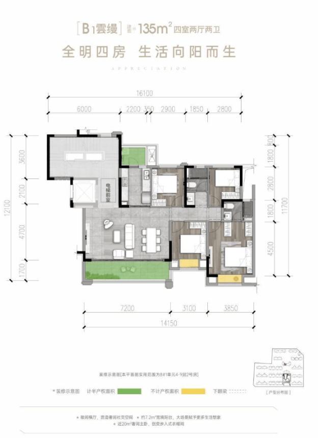 此系产品为社区的高端改善之作,分布于11层的纯洋房楼栋,采用1梯2户的尊享配置。四房两厅的格局更为宽松,主卧多设计为套房,居住私密性与舒适度更高。作为洋房产品,其得房率、社区静谧度及圈层纯粹性都更具优势,是追求一步到位改善家庭的理想选择。