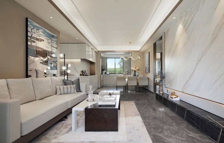 方正空间,大面宽大采光,户户有景可赏,餐客一体通厅,盛纳百般生活意趣,宽幕瞰景阳台,纵揽生活之阔,奢享精致生活。