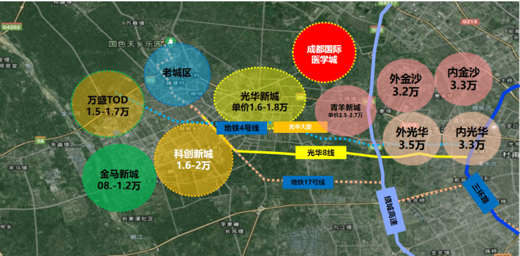 •紧随城市发展,抢占官方规划的“一心两核、三轴四区”,以“三医+AI”产业为核心功能和发展动力的成都清水河高新技术产业走廊,按照“十四五”规划,到2035年,地区生产总值将达12000亿元左右,坐享产业技术高地带来的城市资源先发优势。