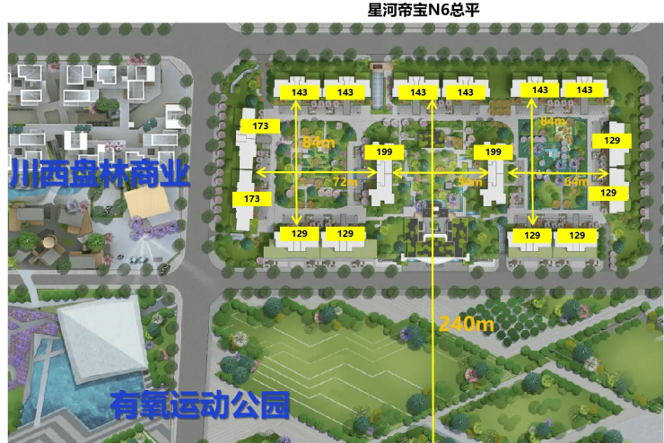 2、创新围合式布局打造三重景观中庭,64-240米超宽楼间距确保户户观景无遮挡