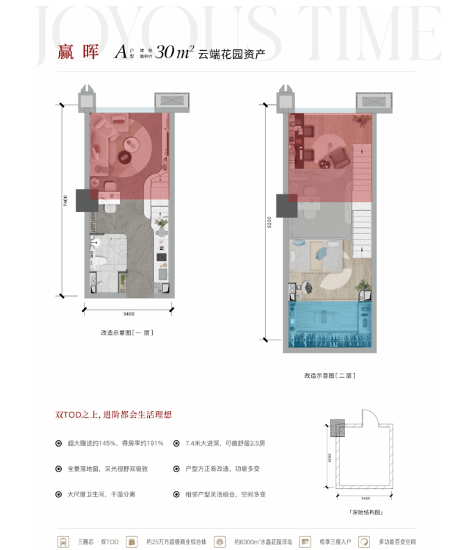 此系列产品是典型的“小面积,大空间”投资利器。以约30㎡户型为例,通过4.2米层高精巧设计,可实现约57㎡的实得使用面积,轻松打造为功能齐全的舒居套二。约60㎡户型则拥有更大的改造自由度。所有户型均能灵活适配自住、长租、民宿、工作室等多重场景。凭借项目双TOD枢纽、自持商业带来的巨量人流,以及周边旺盛的租赁需求,其租金潜力与资产流动性均表现强劲,为投资者提供了一个以较低总价(约40-120万)切入东中环核心区、分享稳定现金流(回报率预计可达7%)的珍贵机会。