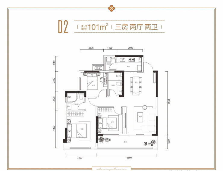 D2户型 约101㎡ 三室两厅双卫双阳台