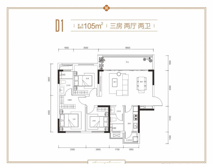 D1户型 约105㎡ 三室两厅双卫双阳台