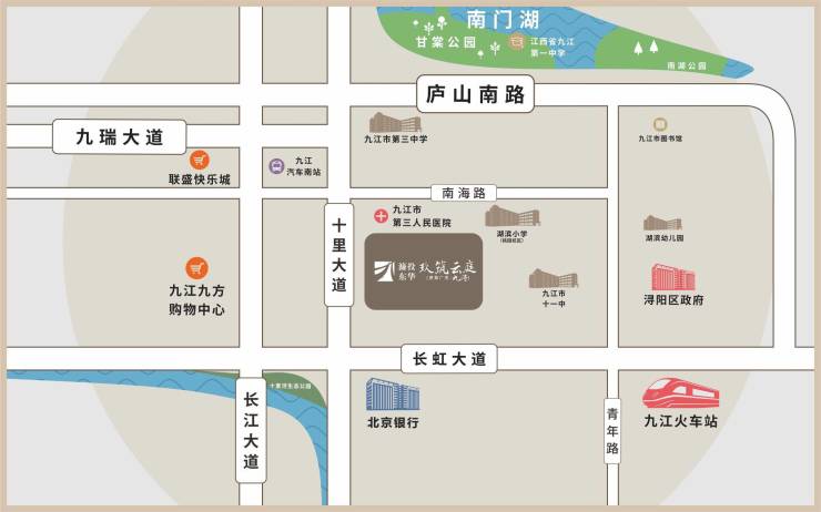 地段 - 傲居九江城芯贵脉,浔阳区、濂溪区、八里湖新区三区交汇尽享繁盛配套;