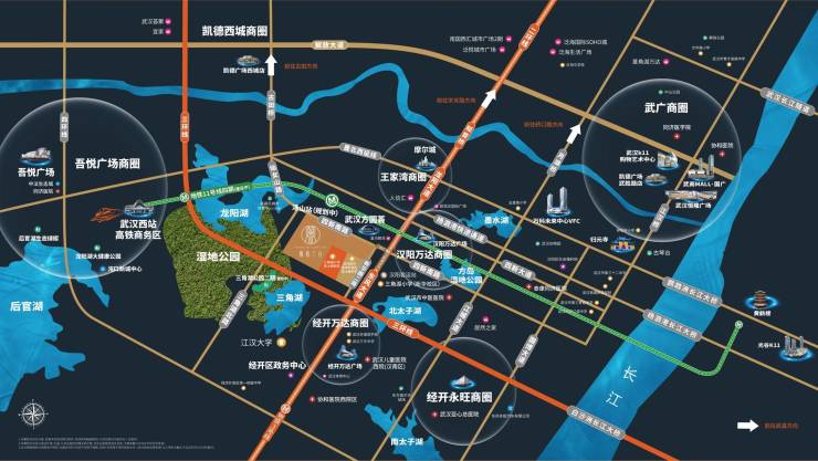 地铁:双地铁交汇——地铁3号线和11号线(规划中)目前已通车地铁3号线【汉阳客运站】位于项目东侧面,距离项目大约1.1公里,步行大约10分钟。项目距离规划中的11号线(龙阳湖南站)大约距离500米左右,后期可直达武汉西站【新汉阳火车站】无缝与其他轨道交通换乘。
