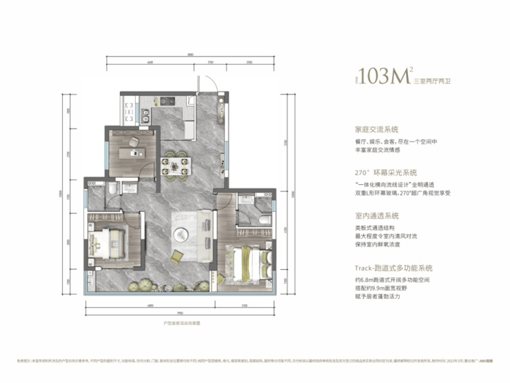 主力户型 103-133㎡三至四房,均实现南北通透、全明采光。133㎡户型拥有 15.2 米连续采光面、51㎡会客厅及 270° 环幕视野;116㎡户型通过洄游动线实现空间灵活切换,双套房设计满足多代同堂需求。装修标准 3000 元 /㎡,首批可升级至 5000 元,采用国际一线品牌精装。