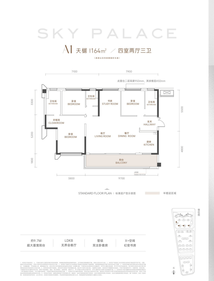 9.7米全景落地窗,270°城市景观视野;LDKB一体化餐客厅,满足高端社交需求;双主卧套房设计,彰显居者尊崇身份;独立书房空间,打造精神栖居领地