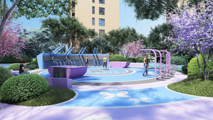 生命在于运动,快乐在于健康,积极向上的社区氛围也是居民关注的重要方面。园内不光设计了一条环形跑道,满足居民对跑步的需求,而且设计了一处青年运动的集中场地。场地内设置各种健身器材,并结合消防登高面设置地面热身场地,结合绿地设置休息座椅,从准备活动到放松修复提供全方位服务,给住户良好运动的体验。周边种植多以色叶开花类植物为主,让住户在运动的同时能感受的徐徐的清风与阵阵花香。