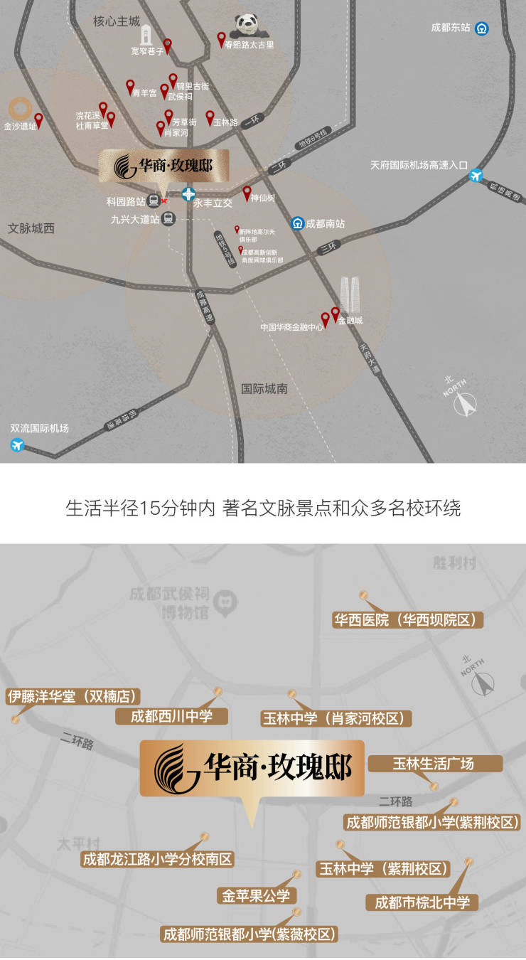 项目 15 分钟车程可达武侯祠、锦里、杜甫草堂、四川博物馆等 7 大文化景点,步行 10 分钟到成都艺术中心(话剧、音乐会演出场馆),满足精英客群对 “文化生活” 的追求。