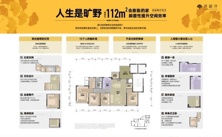 以 112㎡户型为例,它不仅包含生活阳台,方便您晾晒衣物、种植花草;主卧还有转角窗,让更多的阳光和美景进入房间,营造出温馨浪漫的氛围。而且,该户型的精装标准很高,还包含主卧柜体,为您省去了装修的烦恼,让您可以直接拎包入住。