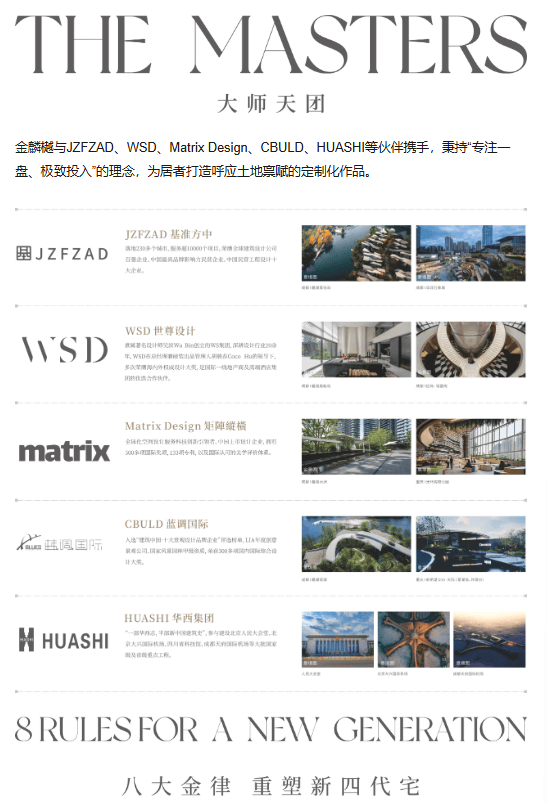 国际大师联袂:项目携手JZFZAD、WSD、Matrix Design等国内外知名设计伙伴,秉持“专注一盘、极致投入”的理念,确保从建筑、园林到室内的全方位顶级呈现。