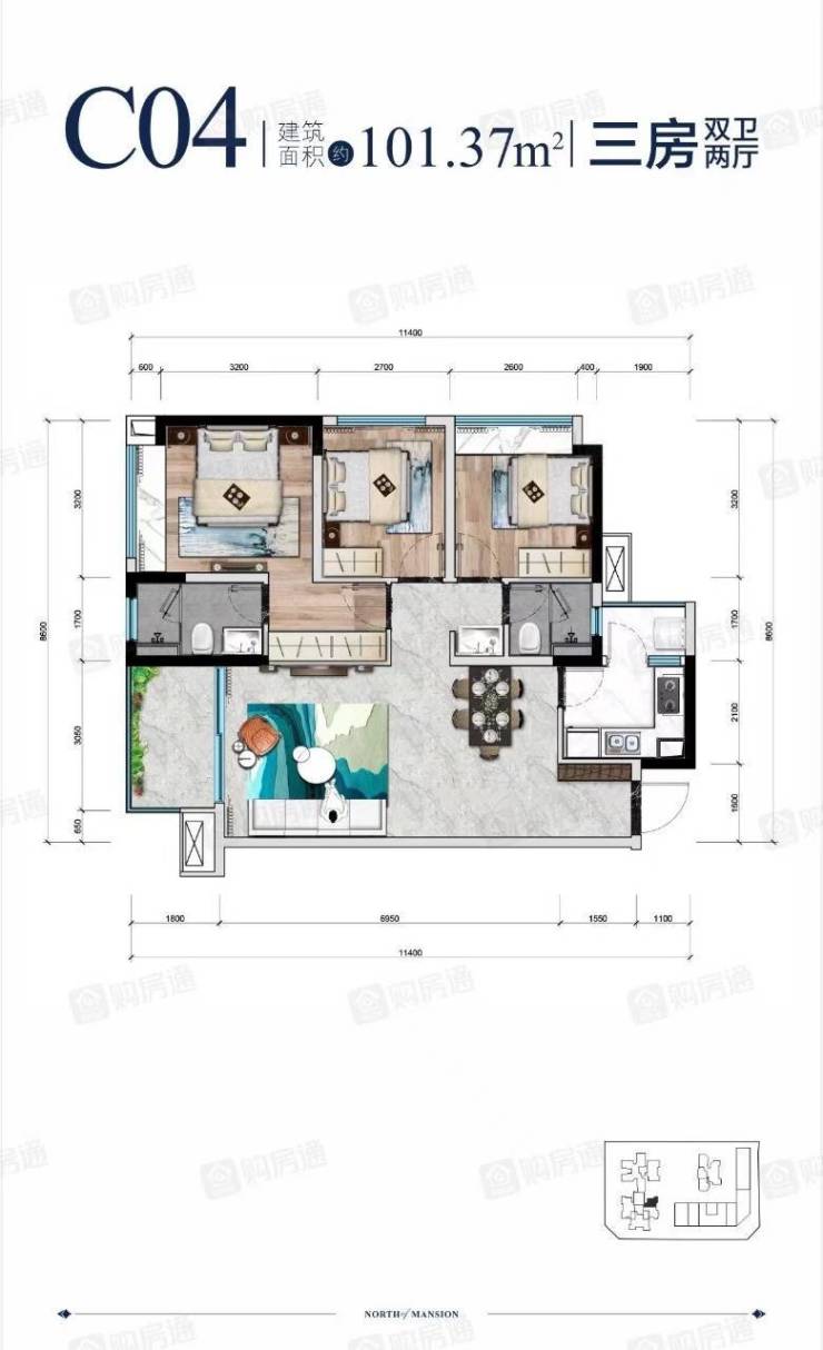 面积区间:101-116㎡(套三双卫)