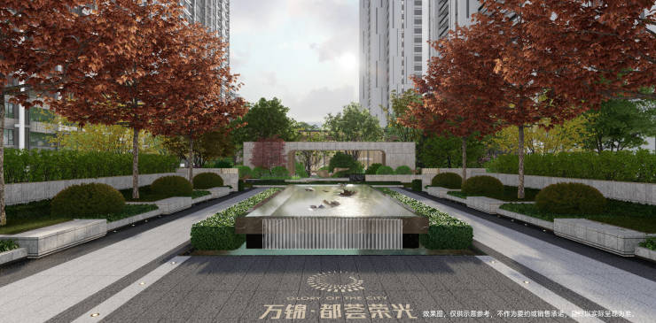 【中轴迎宾水景 移步异景的归家体验】中轴水景两旁,美国红枫阵列排开,水光熠熠,树影斑驳;透景景墙与雕塑相应成趣,营造步移景异的归家体验。