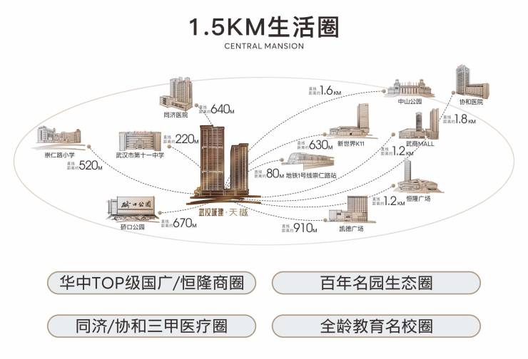 顶序汉口百年天赋内环,京汉大道与崇仁路交汇处,城市高阶烟火气与摩登时尚感融汇在此。领瞰全球高端生活淬炼,凝萃全方位TOP级城市资源,城市顶奢繁华配套聚合于此。