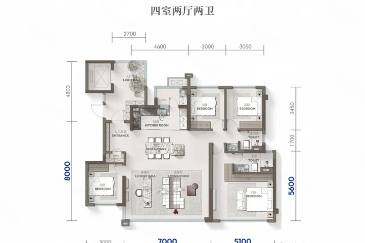 1、采用2梯2户纯板式设计,129-199㎡全系四房户型,满足不同家庭阶段的居住需求