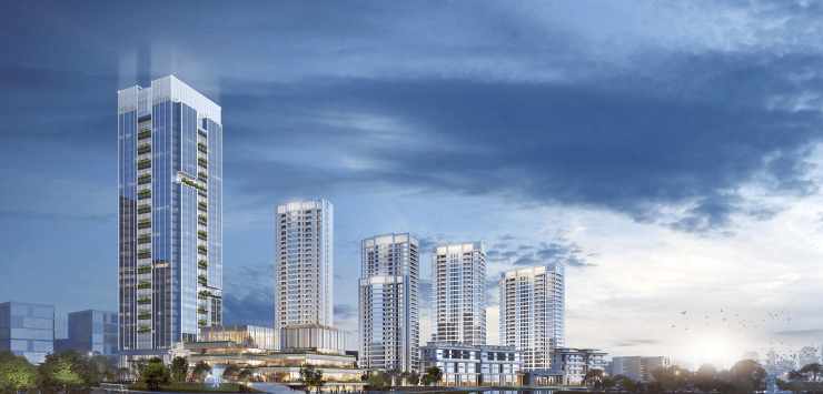 酒店式森境园林: 以“水系+森系”为灵感,打造度假酒店风格园林,建筑隐于绿意,营造自然松弛的高端生活氛围。