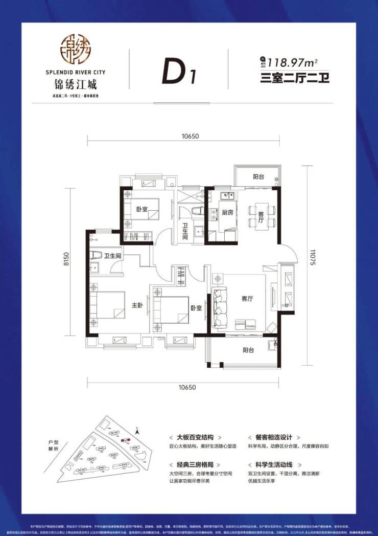 D1户型建面约118平,三房两厅两卫: