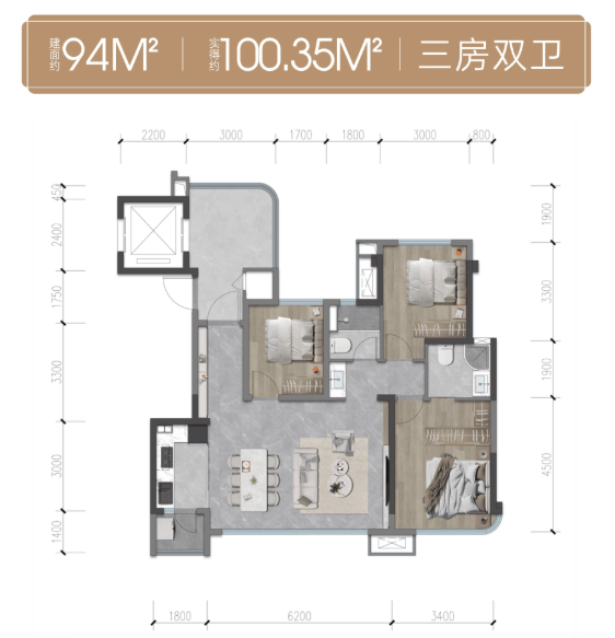 项目主打建面约94㎡和110㎡的全功能三房产品,作为 “新规住宅” ,其核心优势在于极高的实用率与人性化的细节设计,为初次改善家庭提供了超越面积的空间体验。