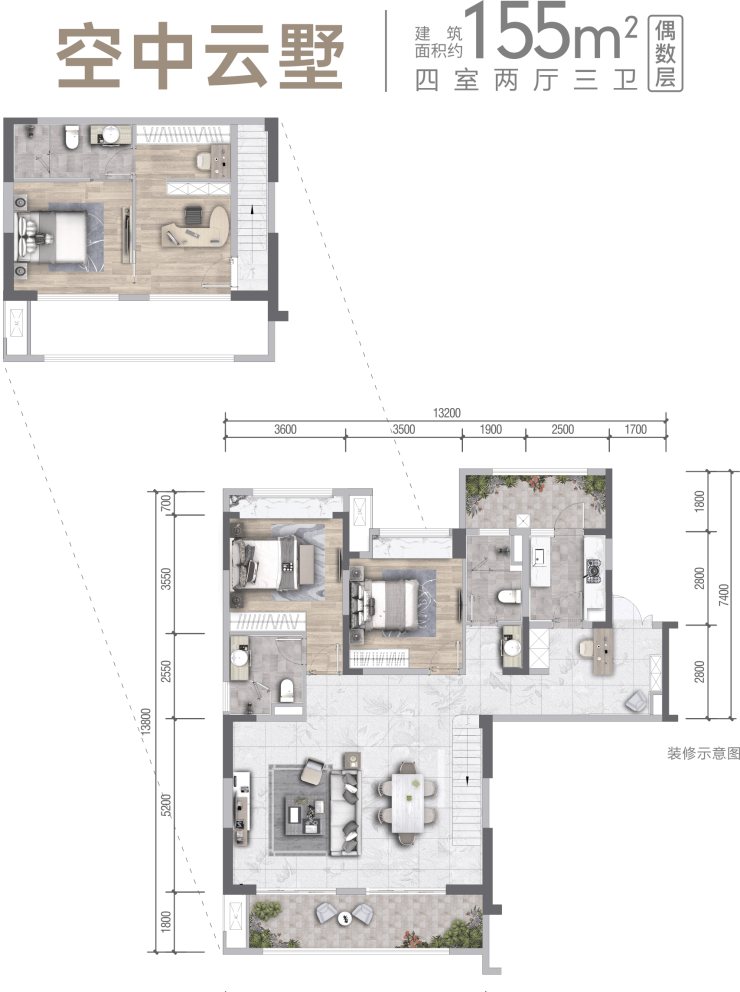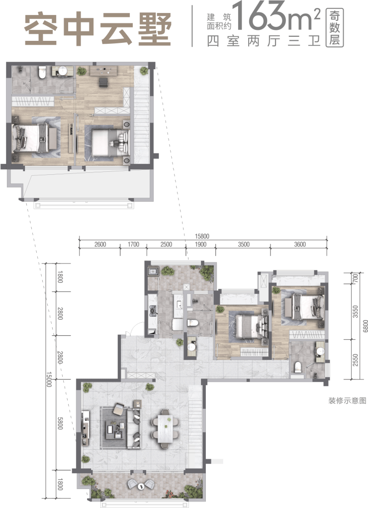 - 空中云墅:建面155-163㎡创新跃层,2梯2户专属配置,空间利用率突破130%