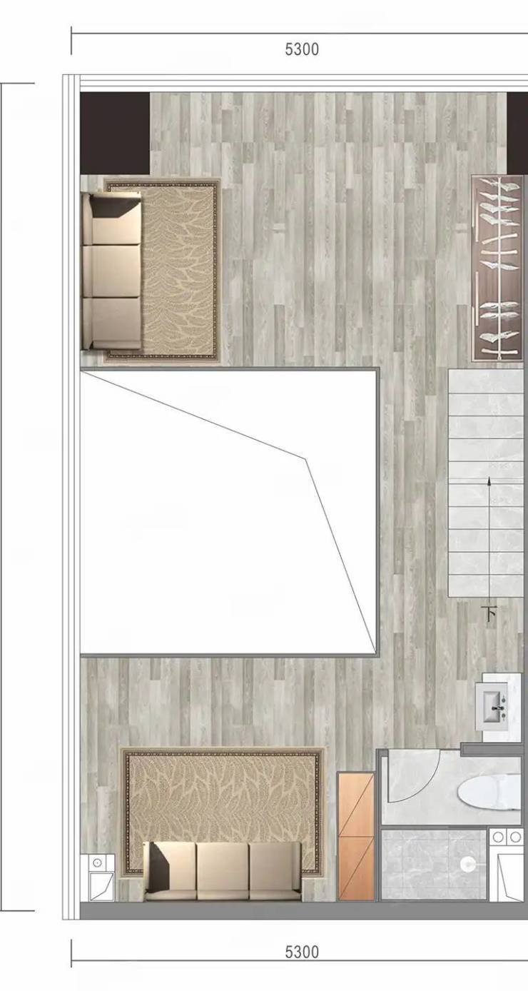 开间5.3米*进深9.5米,开间5.3米的超大采光面;