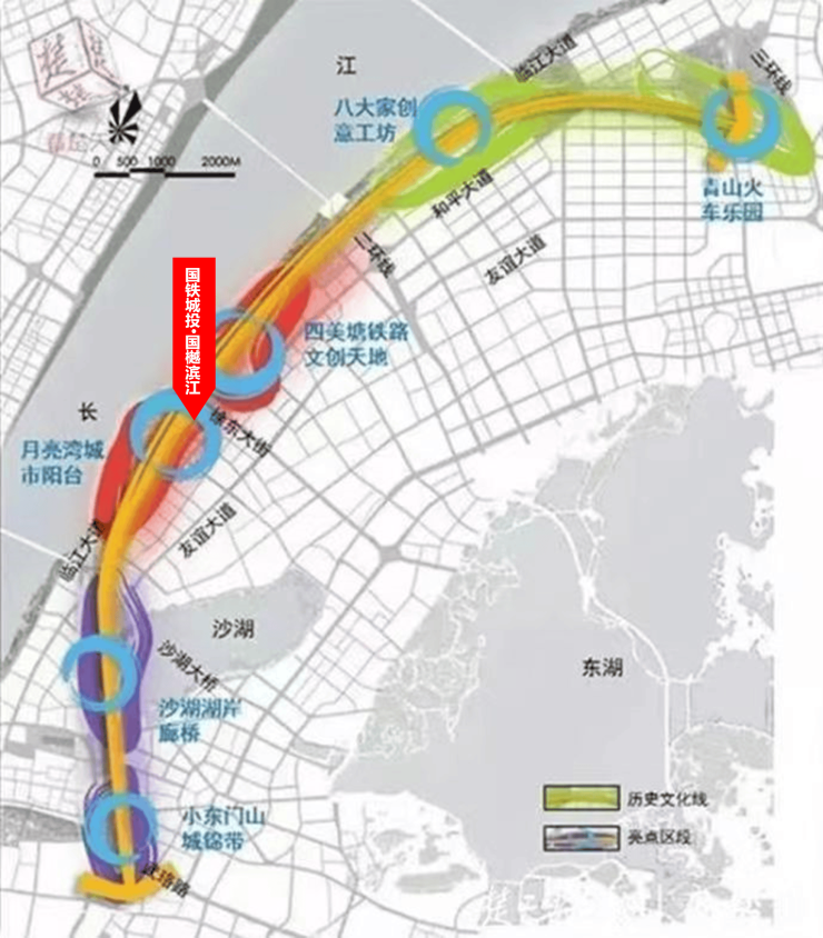总长度13.46公里,共分为两期建设,一期工程已于2020年4月份动工修建,已于2023年完工;该项目共分为三个区段,本案所在区域为武昌滨江人文体验段,包含四美塘铁路文创天地、四美塘公园、月亮湾城市阳台等亮点。