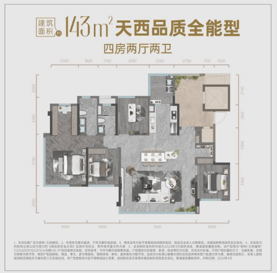 此户型是经典舒适四房的代表,143㎡的阔绰面积为家庭生活提供了更多可能。主卧套房、独立玄关、阔景阳台等设计一应俱全,充分满足了高端改善家庭对居住私密性、仪式感与空间气度的追求。