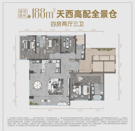 此户型为项目的旗舰产品,188㎡的奢阔面积搭配三卫设计,尊崇感与实用性兼备。它不仅拥有最大尺度的家庭厅与主人套房,更通过多套房、多功能空间等设计,为城市塔尖人群提供了承载家族传承、高端社交与个人志趣的终极居所。