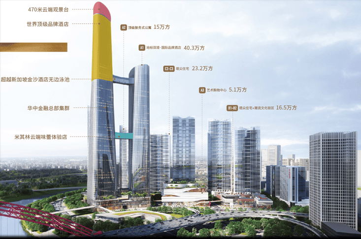 BFC复星外滩中心|御江廷,作为武汉内环首个艺术地标综合体,占地面积约10.2万平方米,以1.7倍于二七滨江商务区的开发投资,5倍于武汉天地总开发,总建筑面积约140万方,其中包含: