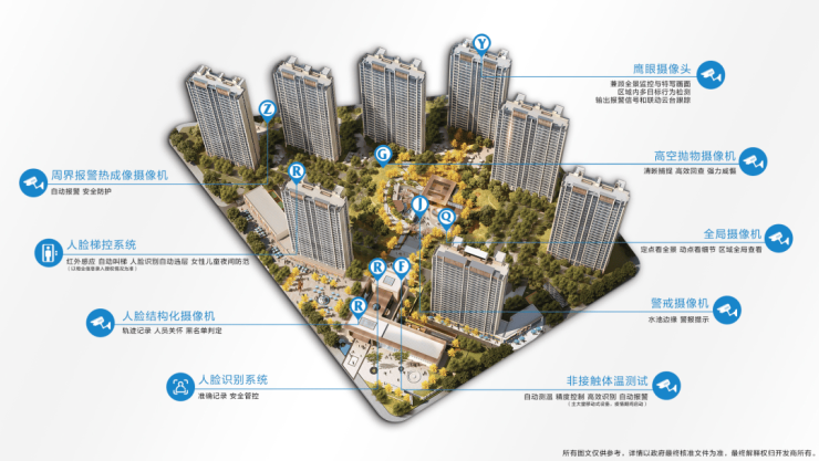项目配备人脸识别、人脸梯控、高空抛物摄像机等智慧社区系统,提升品质生活,营造更健康、便捷、安全、舒适的生活环境。