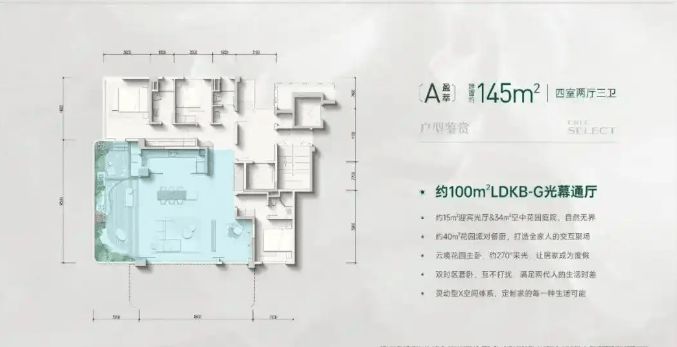 04 主力产品解析 精粹145-183㎡四代住宅,以空中庭院为核心,通过场景化设计满足塔尖家庭对功能、安全与诗意的全维追求