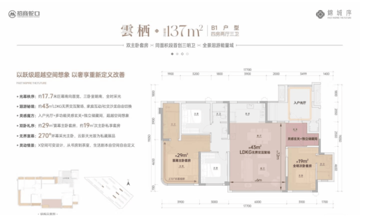 此户型为设计的精髓,得房率约112%。采用LDKG一体化方厅设计,客餐厅面积约43㎡。最大亮点在于南向面宽约17.7米,实现四个房间全部朝南,采光极佳。配备双套房,主卧套房达29㎡并拥有270°采光视野,功能与舒适度堪称标杆。