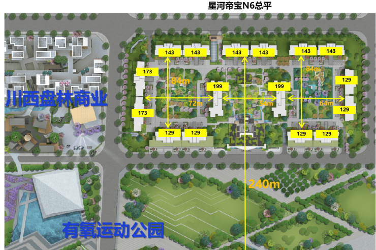 2、创新围合式布局打造三重景观中庭,64-240米超宽楼间距确保户户观景无遮挡
