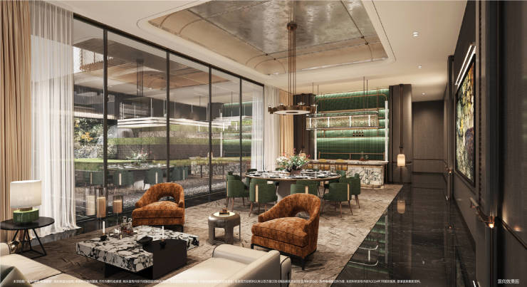 设计师以东方摩登韵味打造双重下沉庭院,以高规格规划约4000方会所,集月华阁、健身中心、私宴及共享餐厅、行政酒廊、瑜伽馆、壁球馆、室内全龄恒温泳池为一体,以及高层全架空主题空间,完善全龄乐动的生活体系。