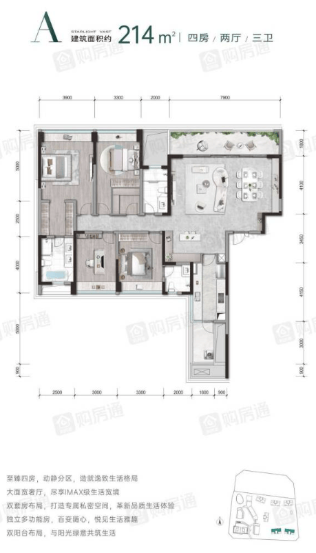 项目主力户型聚焦于建面约165㎡与214㎡的精装四居产品,旨在满足多代同居的大家庭或追求极致空间体验的改善客群。户型设计以奢阔尺度、科学动线和全面功能为核心,承载家族传承与品质生活的双重想象。