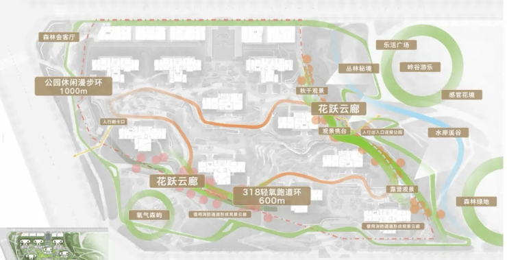 ·社区内打造约600米轻氧跑道环,提取318国道川藏线著名景点元素,落位跑道环形区,打造天府地理知识科普类健康跑道。