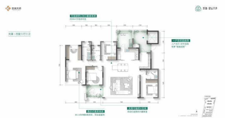 的奢阔四房,户型均注重空间的互动性与景观的渗透性,超大横厅连接宽境阳台,将中央公园的景色最大化引入室内,营造出度假感十足的日常居住氛围。