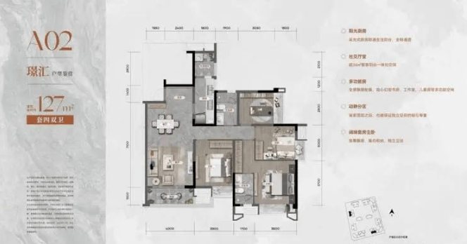 此户型定位为高性价比多功能改善。创新 “三开间朝南” 布局与 “3+1”可变空间设计,在有限面积内实现了四房功能,并预留了书房、儿童活动室等改造可能,实用率极高。
