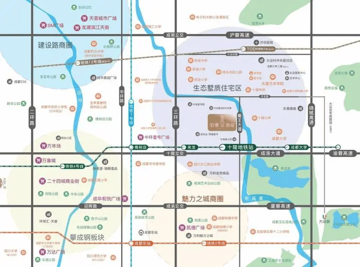 项目坐落于龙泉驿区蜀王大道北段33号,地处东三环青龙湖板块的核心地段。这一区域恰好位于成都“中优”与“东进”两大发展战略的交汇地带,既能享受主城更新的红利,又能承接城市向东发展的势能,是城市发展的新兴热点区域。