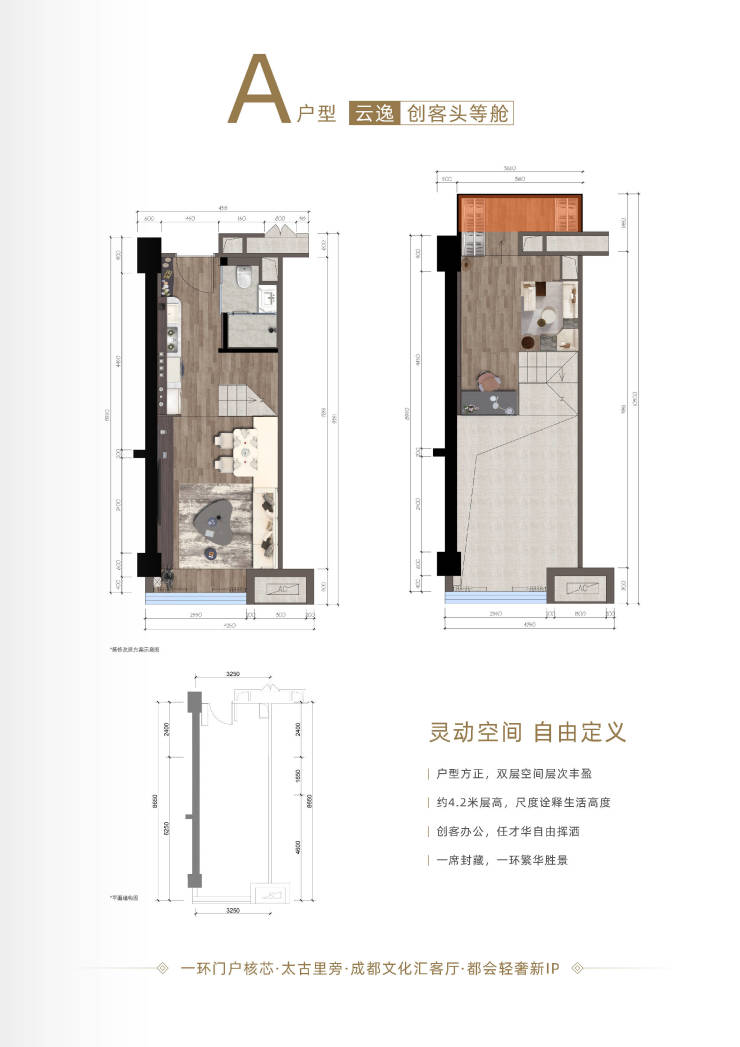 公寓产品:建面约35-42平,主力面积38平,层高4.2米,标准loft公寓,单层面积1100平,可自由组合,随心搭配!