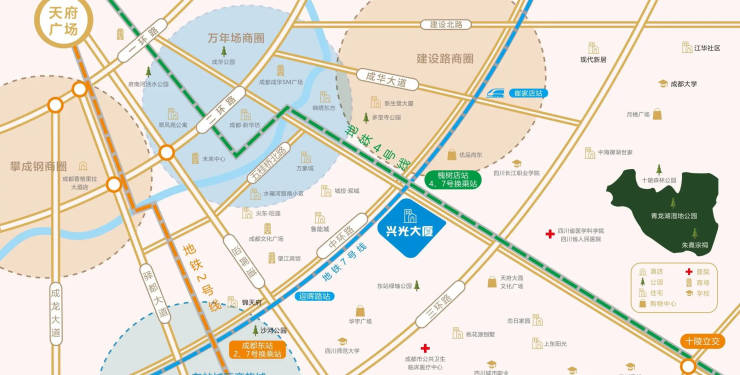 中环主轴:槐树店路与中环路交汇,即可快速抵达二环路、三环路,同时接驳龙潭立交、东至十陵客运枢纽,又可即时对接城南高速、成绵高速,实现城内城外通勤便捷畅通。