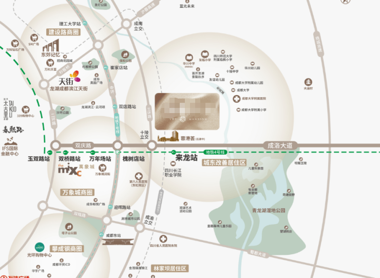 轨道交通:距4号线来龙站仅50米,1站直达槐树店枢纽,2站接驳万象城商圈,5站直抵春熙路核心区,远期规划32号线贯通全城