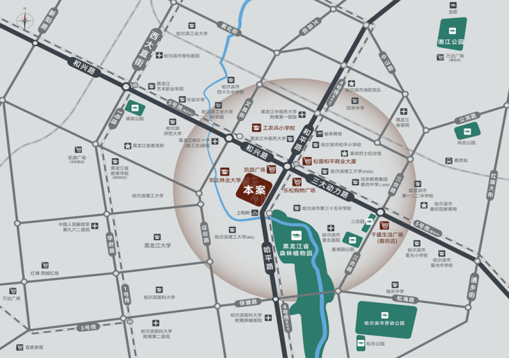 【教育配套】人文书香底蕴浓厚,临近林大、中医大、理工、黑大多所高校,自身规划幼儿园、教育用地,优越人文环境和资源配置铺就子女锦绣前程;